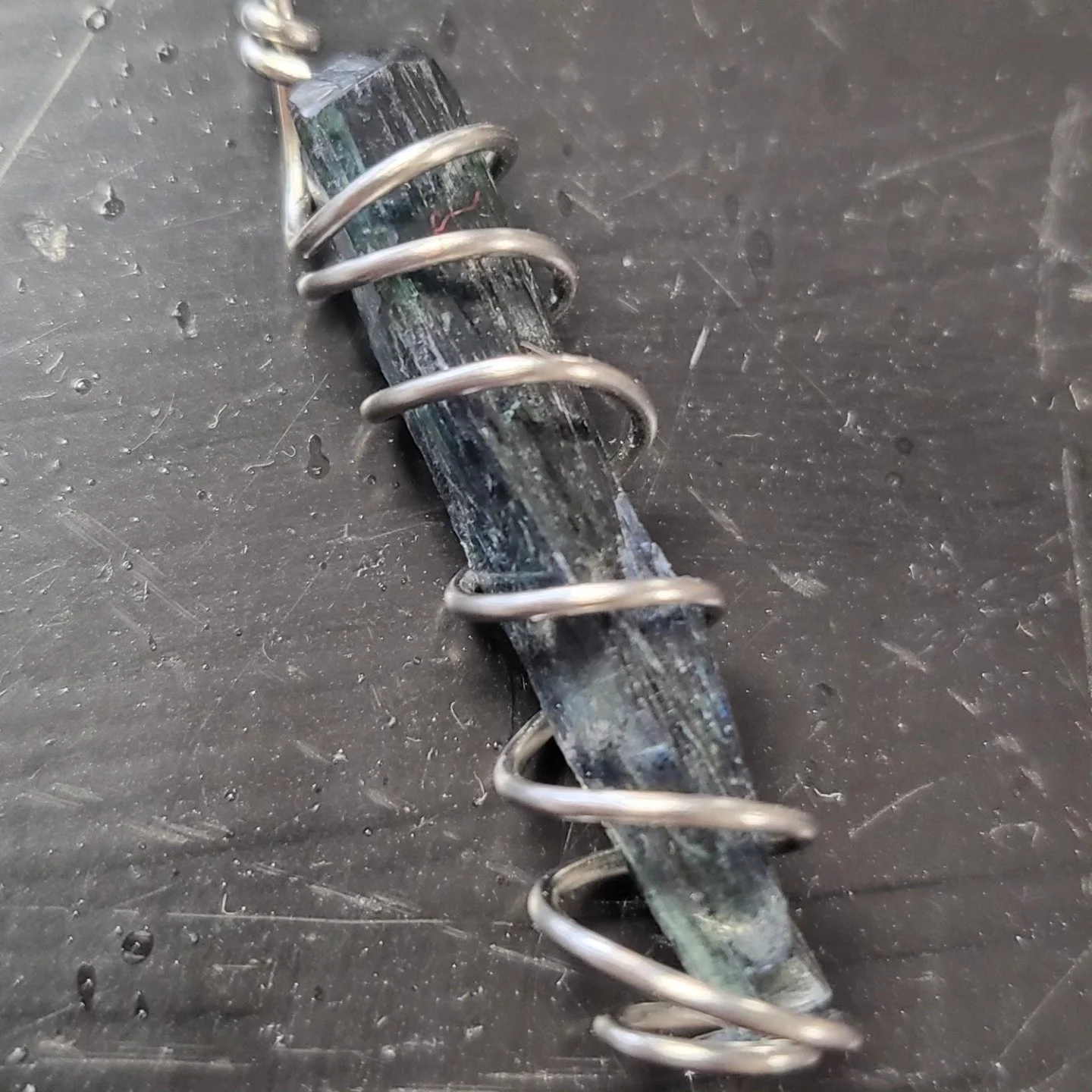 A close-up of a silver wire wrapped around a rectangular green gemstone, forming a decorative pendant or piece of jewelry.
