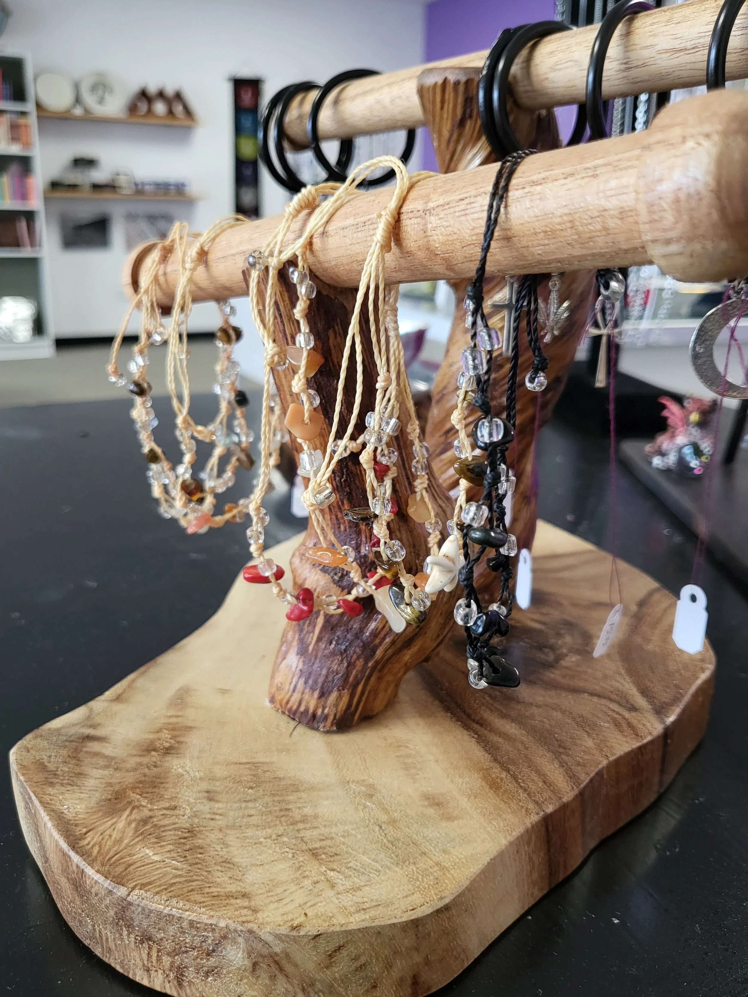 Wooden jewelry display stand with various beaded necklaces hanging on it, set on a wooden base in a store or craft space.