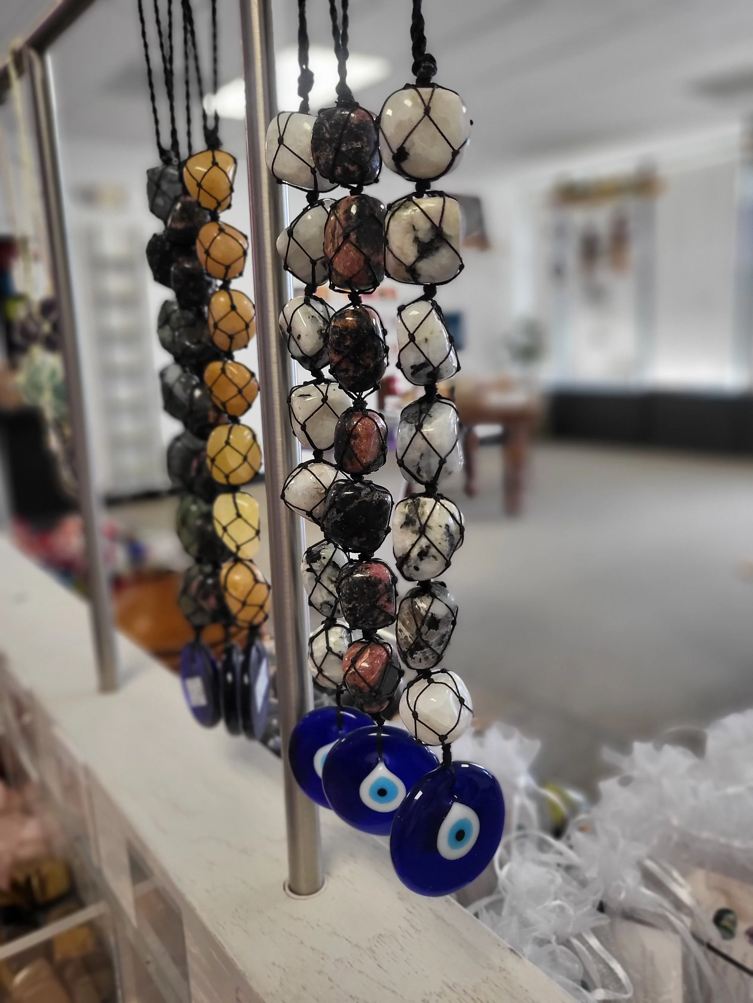 Interior of a gift or craft shop with shelves filled with books, decorative items, and crystals, and tables displaying various products.